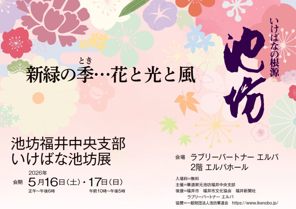 池坊福井中央支部による「いけばな池坊展」を、2026年5月16日(土)・17日(日)の2日間、エルパ2階エルパホールにて開催いたします。