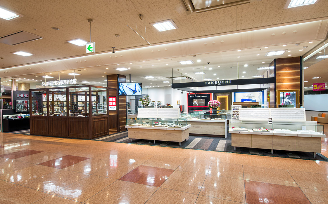 1Fタケウチでは、ロイヤルアッシャー・ラザールダイヤモンド・モニッケンダムの三大カッターズブランドを中心としたブライダル、冠婚葬祭に1つは持っていたいパール、定番から流行までおさえたファッションジュエリー、グランドセイコー・アテッサ・G-SHOCKをはじめとした充実の時計と皆さまにご満足いただけるラインナップとなっております。