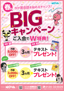 NOVAでは3月限定で、新規入会者様にBIGなキャンペーンを開催中です。